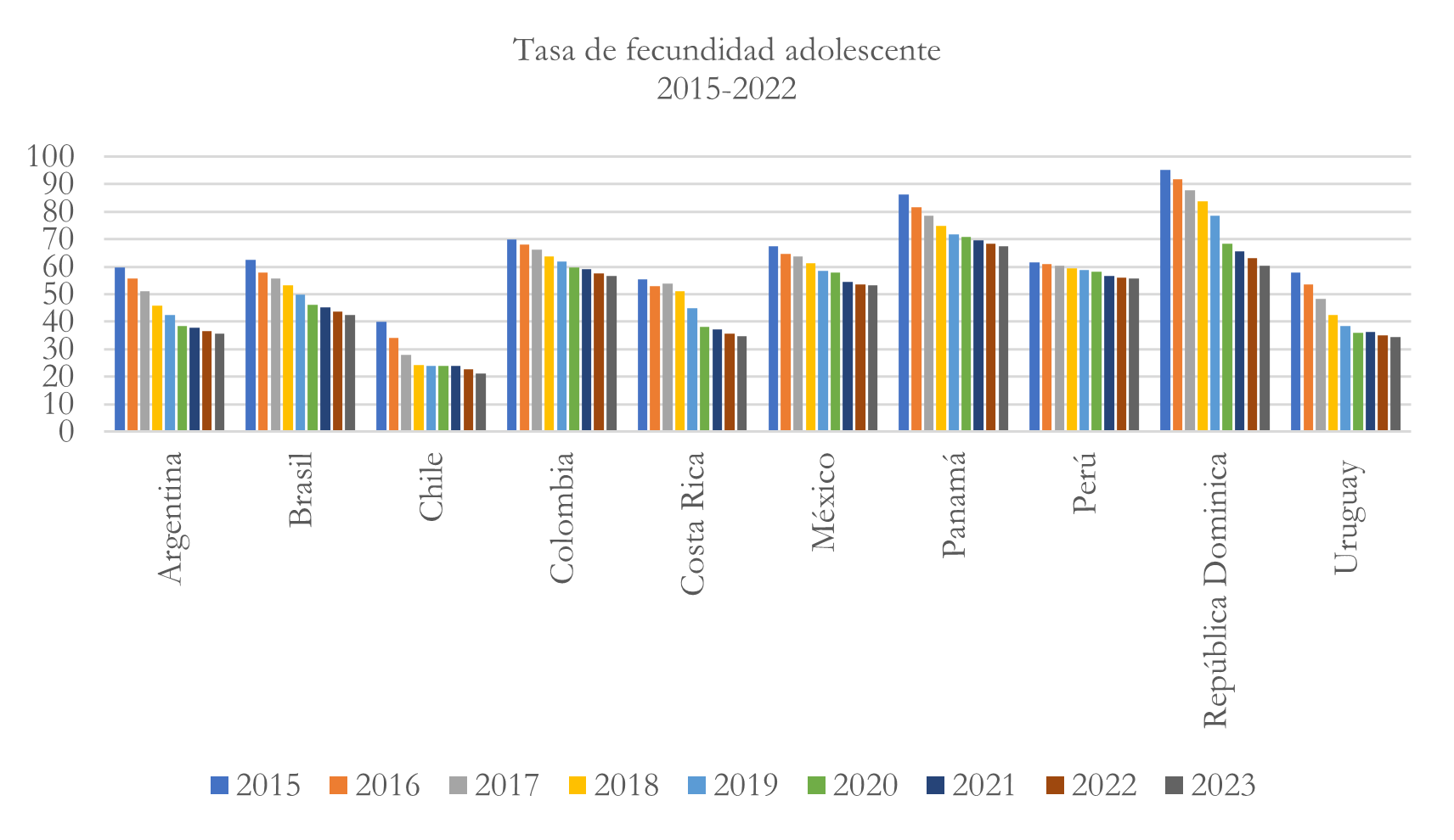 La tasa de fecundidad adolescentes para el caso de los diez países analizados presenta una disminución entre 2015 y 2023. No obstante, en este caso, República Dominicana, junto, con Panamá presentan las tasas más altas, así, por ejemplo, para el país dominicano la tasa de fecundidad en adolescentes en 2023 se ubicó en 60 nacimientos ocurridos entre mujeres adolescentes, mientras que, en el caso de Panamá ocurrieron 67 nacimientos. Los países con los resultados más bajos son Chile y Uruguay con 21 y 34 nacimientos entre mujeres adolescentes respectivamente.