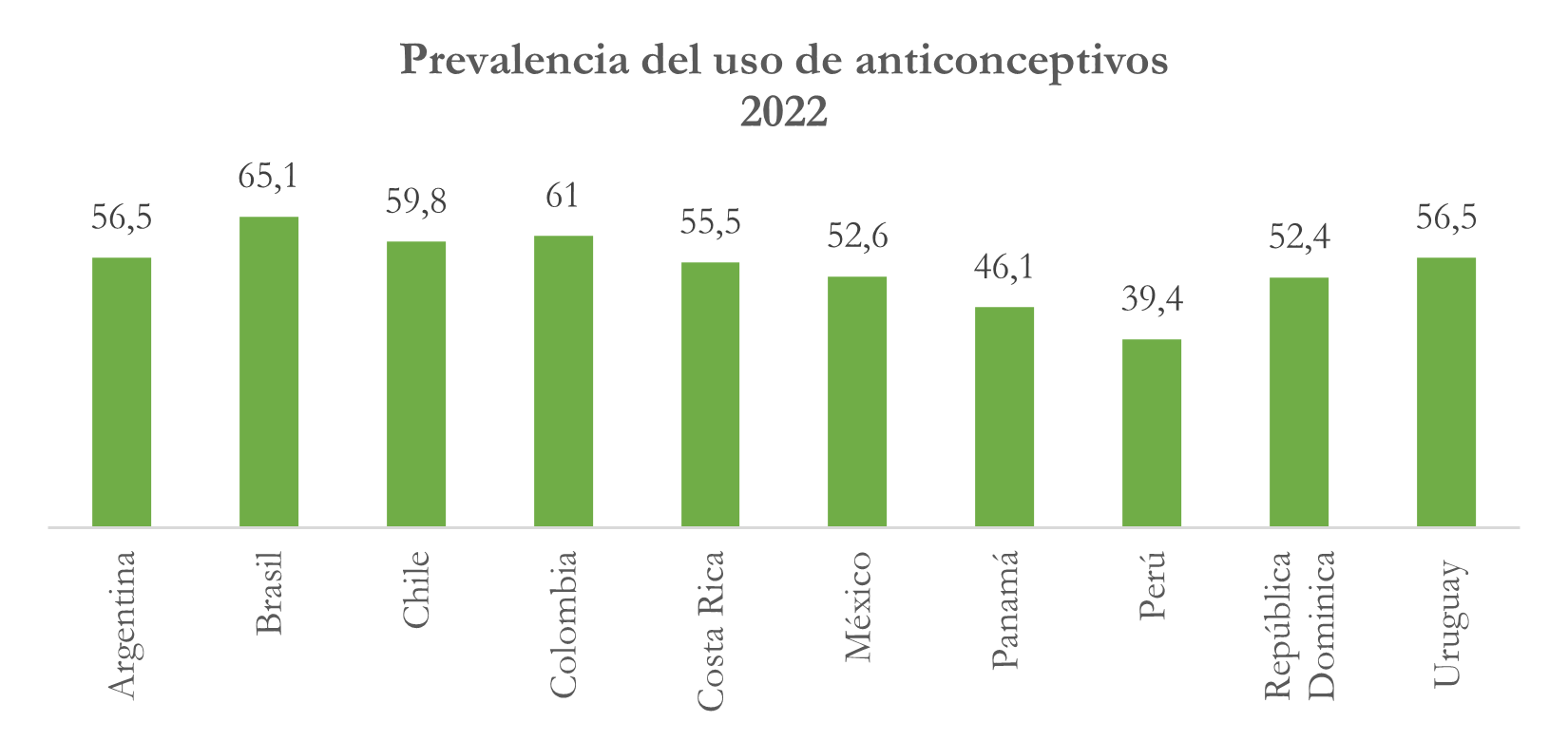 Para 2023 la mayoría de los países se ubican entre el 50% y el 60%, exceptuando Perú y Panamá que presentan una prevalencia en el uso de anticonceptivos por debajo del 50%, siendo el caso peruano el que más llama la atención, porque sólo el 39,4% de las mujeres en edad fértil (generalmente entre 15 y 49 años) están utilizando algún método anticonceptivo para evitar un embarazo no deseado. Este dato de la prevalencia en el uso de métodos anticonceptivos es importante, ya que, arroja información valiosa sobre la planificación familiar y la salud reproductiva en los países. De esta manera, puede indicar una buena disponibilidad de métodos anticonceptivos y por ende, la existencia de un número importante de programas que le permiten a las mujeres acceder a servicios de salud reproductiva. Igualmente, este ligado a la disminución de los embarazos no deseados y demuestra un cambio importante en la autonomía de las mujeres.