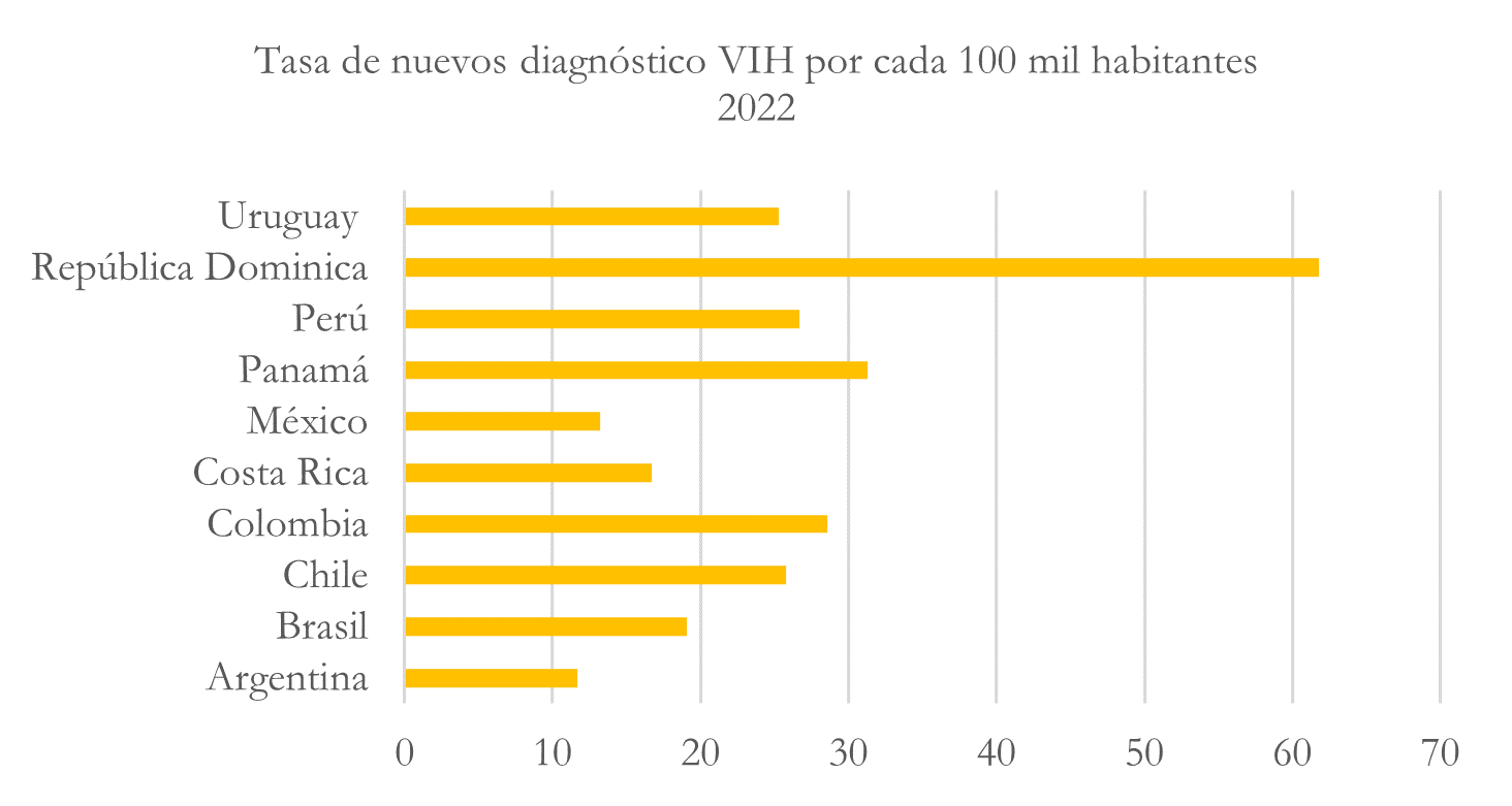 Para el caso de la tasa de nuevos diagnósticos VIH se encontró que Argentina es el país con el menor número de nuevos casos, así, la tasa se ubicó en un 11,5%, seguido de México en el cual se reportaron 13 personas diagnosticadas por cada 100 mil habitantes. No obstante, República Dominicana y Panamá son los países con el mayor número de casos nuevos, 61 y 31 casos nuevos. Estas tasas son importantes porque permiten establecer nuevas estrategias de prevención, sobre todo, en los países en los cuales el número de nuevos casos sigue siendo importante y mantener las acciones en los países en los cuales la tasa de nuevos casos ha disminuido considerablemente en los últimos cinco años.