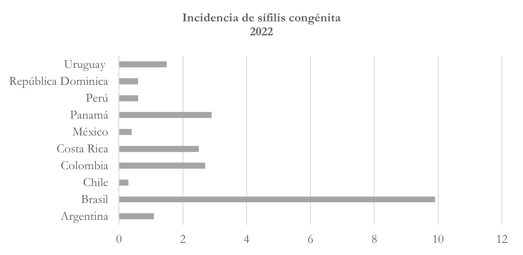 En el caso de la incidencia de sífilis congénita se puede observar que la cantidad de casos nuevos de sífilis que se transmiten de madre a hijo durante el embarazo o en el momento del parto varía según el país, así, Brasil tiene una tasa significativamente más alta, con 9,9 casos por cada 1,000 nacidos vivos. Esto indica una prevalencia mucho mayor de sífilis congénita en comparación con los demás países, seguido por Panamá que tiene una tasa moderada, con 2,9 casos por cada 1,000 nacidos vivos. Otros países de la región como Colombia y Costa Rica también presentan tasas moderadas, aunque superan a Uruguay (1,5) y Argentina (1,1). Chile y México presentan las tasas más bajas entre los diez países.