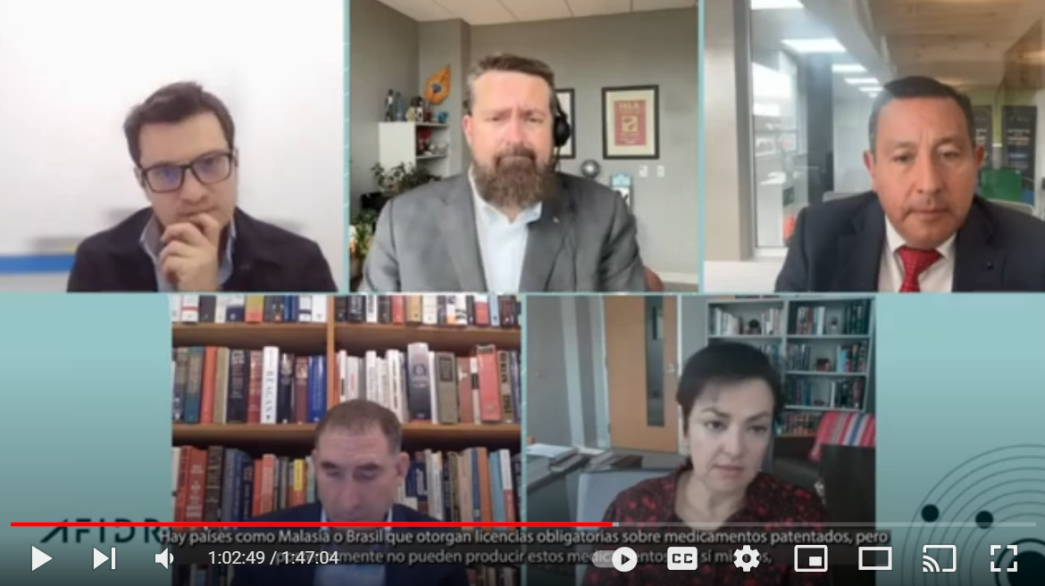 Asimismo, se planteó una nueva pregunta, sobre diferentes recomendaciones para el país que puedan generar un balance entre la Propiedad Intelectual y el acceso a la innovación en salud, a esto Michiko respondió que es necesario explorar nuevas formas, en particular nuevas tecnologías, para desarrollar terapias sanitarias, pero reduciendo los costos de desarrollo de estos productos. Mark añadió que la mejor manera de desarrollar un sistema de atención sanitaria es no socavar la inversión en productos farmacéuticos o nuevas licencias tecnológicas. Por tanto, debemos romper con la tendencia a buscar respuestas fáciles y debemos salir al campo, construir infraestructura, establecer clínicas y formar a los proveedores de atención sanitaria. Por último, Stephen concluyó que, para compartir tecnologías a nivel global, se deben promover las licencias voluntarias, un ejemplo de esto es el proyecto de Mark “Innovar para la Salud que destacan cómo los empresarios y países en desarrollo están trabajando para resolver los problemas de salud global.