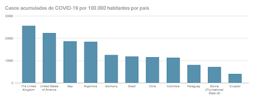 Desde la declaración de Ómicron como variante de interés por parte de la OMS (26 de noviembre 2021), dada su alta transmisibilidad, el número de casos activos en el mundo creció un 71%; así, por ejemplo, para el caso de América Latina, se experimentó un crecimiento inquietante: la OPS estimó que el 1 de enero los casos reportados en la región ascendían a 3,4 millones, mientras que, para el 8 de enero se contaban alrededor de 6,1 millones. Colombia también percibió un aumento en los casos positivos; así, durante los primeros días del mes de enero, el país pasó de 13.576 casos activos a 73.378. Por tal razón, en días pasados, el MinSalud señaló que la variante Ómicron tenía un potencial de contagio de cinco a diez veces mayor que otras variantes, aunque los casos positivos han aumentado considerablemente por Ómicron, esto no significa, necesariamente, que “casi toda la población” vaya a contagiarse al mismo tiempo, es decir, no existe evidencia contundente que indique que toda la población terminará contagiada. De todos modos resulta muy difícil establecer el número exacto de personas contagiadas, dado el subregistro (no todas las personas con síntomas se realizan la prueba y hay personas asintomáticas). Colombia, según la base de datos de la Covid 19 de la OMS, tiene 11.628 casos acumulados activos de Covid-19 por cada 100.000 habitantes. Al comparar el país con 12 países (tres europeos y ocho de la región de América), Colombia se ubica en el puesto ocho entre los 12 países (ver gráfica) con casos positivos acumulados.