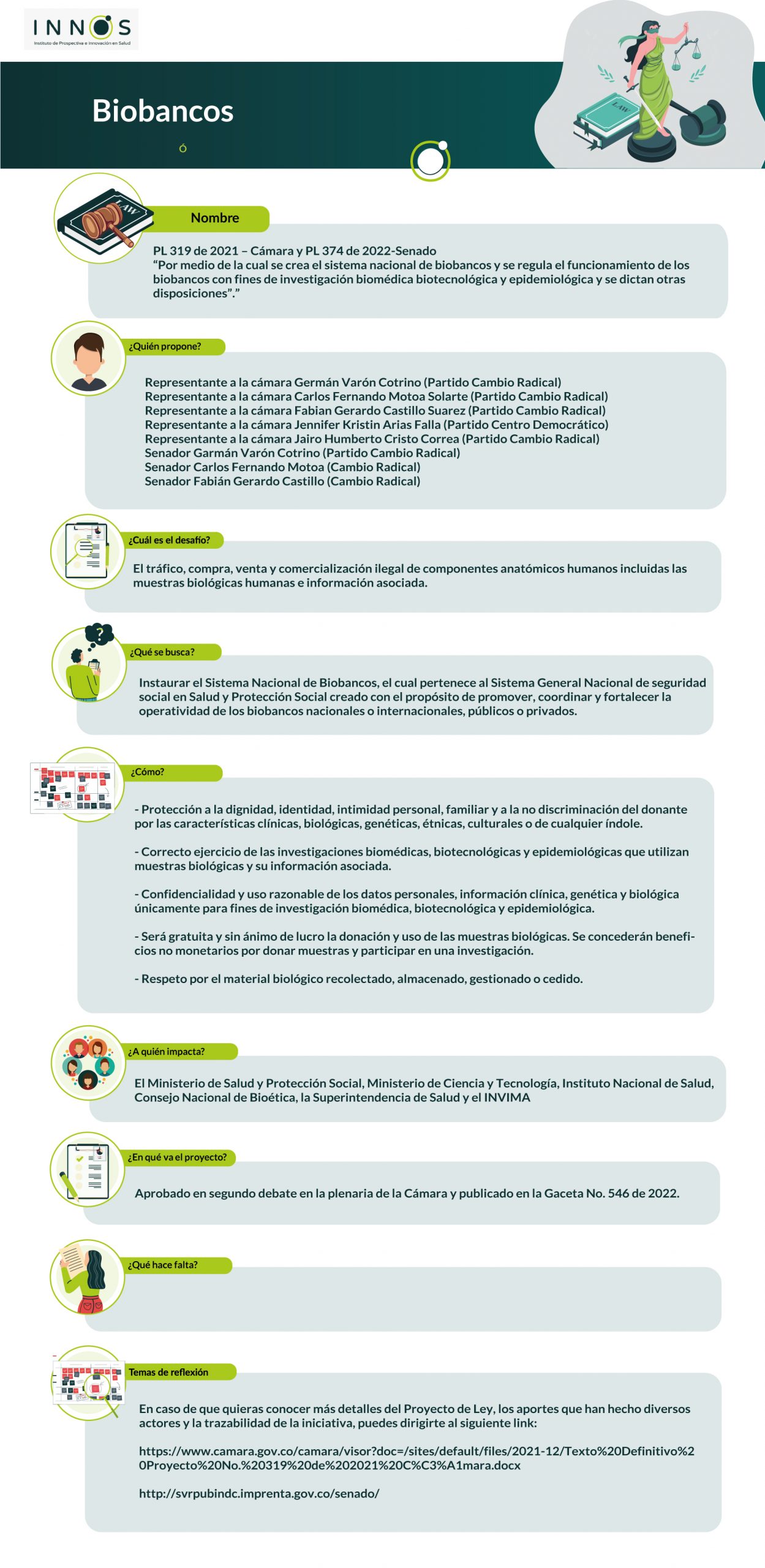 PL 319 de 2021 – Cámara y PL 374 de 2022-Senado “Por medio de la cual se crea el sistema nacional de biobancos y se regula el funcionamiento de los biobancos con fines de investigación biomédica biotecnológica y epidemiológica y se dictan otras disposiciones”.”
