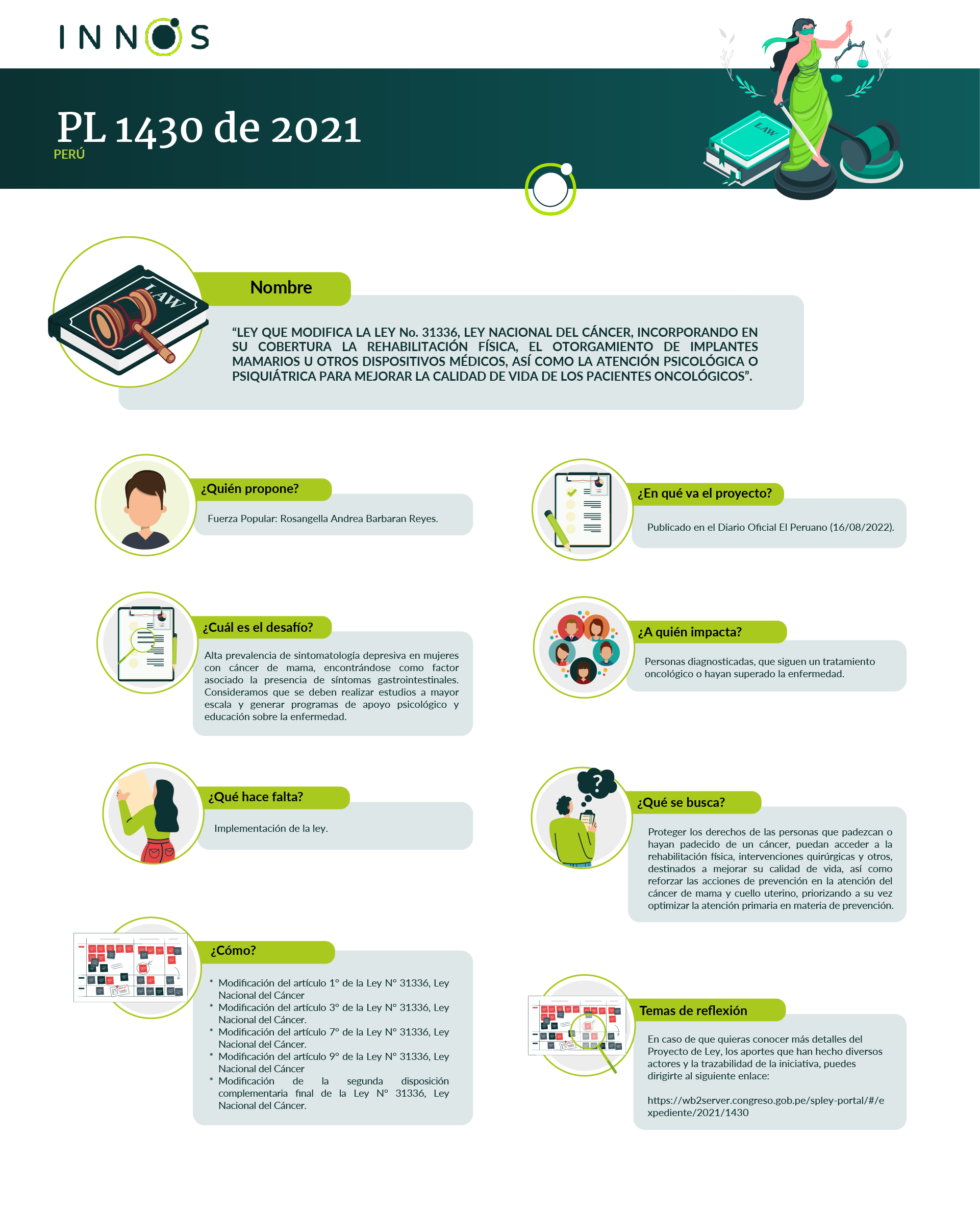 PL 1430 de 2021 – “LEY QUE MODIFICA LA LEY No. 31336, LEY NACIONAL DEL CÁNCER, INCORPORANDO EN SU COBERTURA LA REHABILITACIÓN FÍSICA, EL OTORGAMIENTO DE IMPLANTES MAMARIOS U OTROS DISPOSITIVOS MÉDICOS,ASÍ COMO LA ATENCIÓN PSICOLÓGICA O PSIQUIÁTRICA PARA MEJORAR LA CALIDAD DE VIDA DE LOS PACIENTES ONCOLÓGICOS”