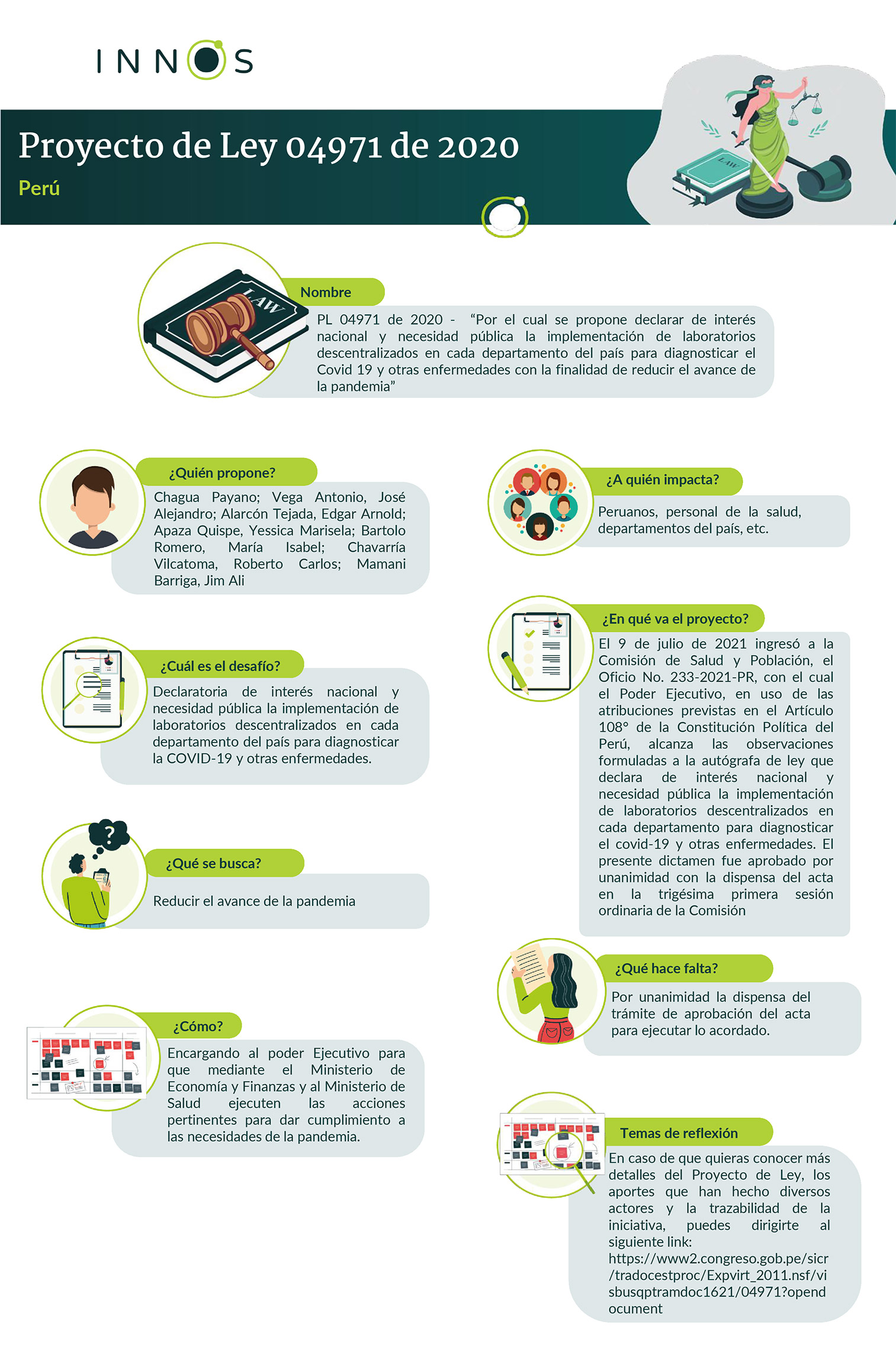 PL 04971 de 2020 – “Por el cual se propone declarar de interés nacional y necesidad pública la implementación de laboratorios descentralizados en cada departamento del país para diagnosticar el Covid 19 y otras enfermedades con la finalidad de reducir el avance de la pandemia”