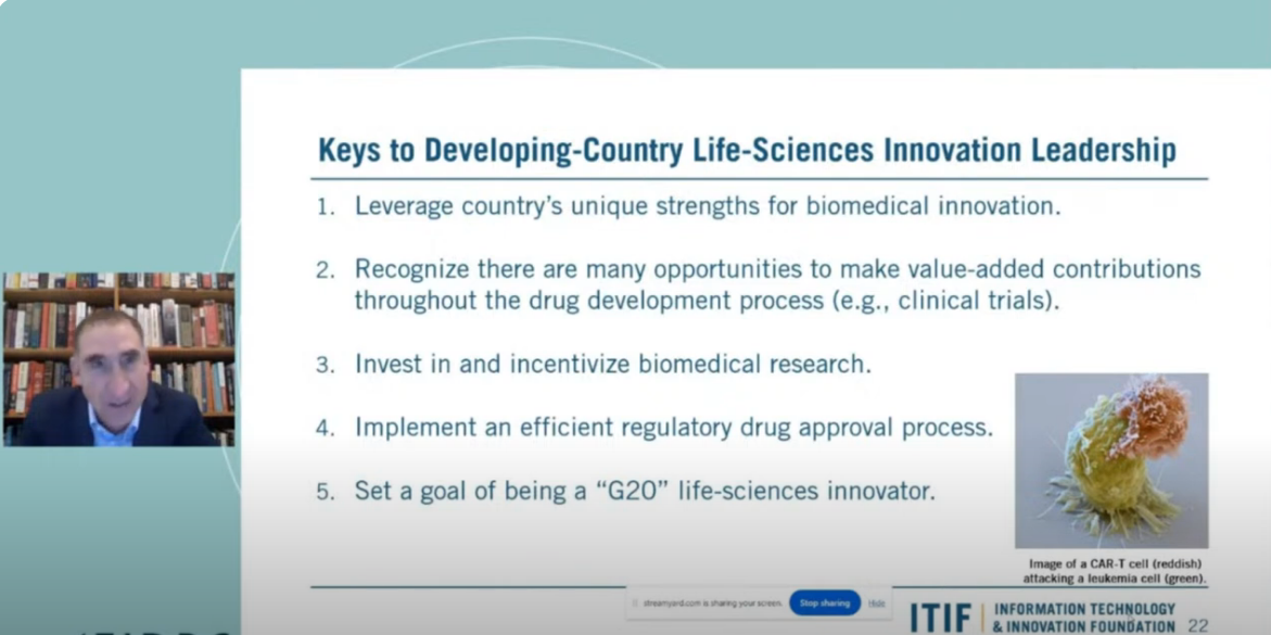 Finalmente, para avanzar en las recomendaciones hacia una política de innovación: es necesario el desarrollo de una estrategia de innovación y productividad, el uso de las universidades como catalizadores de la innovación, otorgar a las universidades derechos sobre la propiedad intelectual de las actividades de I+D financiadas públicamente, promover licencias empresariales para estudiantes y profesores, instaurar créditos fiscales para la I+D colaborativa entre universidades e industria, diseñar incentivos fiscales para motivar la inversión empresarial en I+D universitaria, mejorar la formación laboral y el uso de equipos avanzados, y aprovechar las capacidades del país para la innovación biomédica. Asimismo, enfatizó la importancia de identificar oportunidades para generar valor en el desarrollo de medicamentos, garantizar un sistema eficiente de aprobación regulatoria de medicamentos, ser innovadores en ciencias biológicas dentro del G20 y asegurar derechos sólidos de propiedad intelectual.